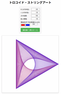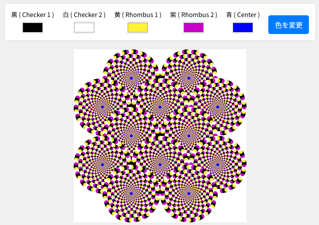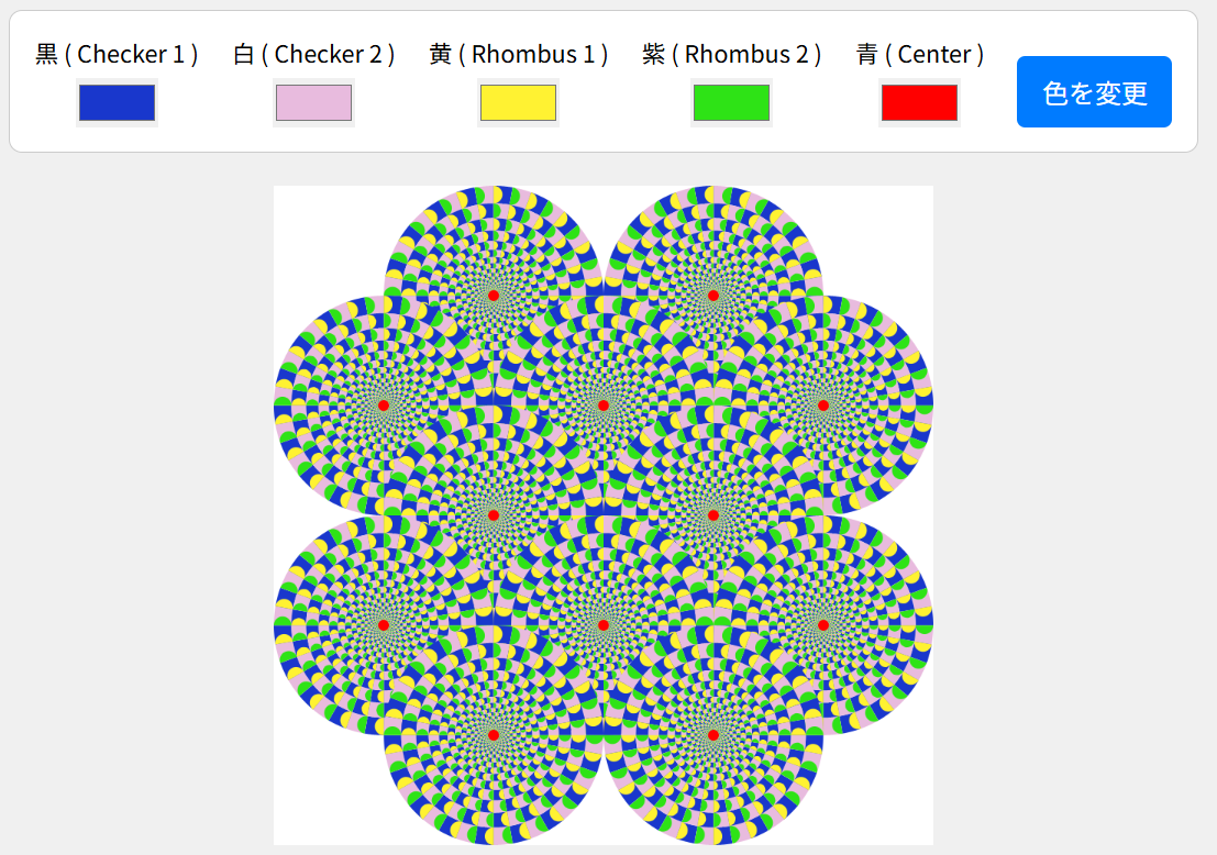 2025年10月8日 / 最終更新日時 : 2025年10月8日 Toshikazu NEWS 錯覚アート「蛇の回転」色変更バージョン Tomsさんの「数学アートの部屋」におもしろい錯覚アートがあって、Processingで書かれたコードが紹介されていたので、色を自由に変更できるようにしてみました。 元の絵は下の色ですが、それを自由に色を変えて行けます。2枚目は変えた一例。 ⇒ここからやれますので自分で色を変更して見てください。 なお、プログラムが重いので、絵が出るまでに時間がかかります。 ⇒「生成AIを活用したプログラム全リスト」 “錯覚アート「蛇の回転」色変更バージョン” に対して1件のコメントがあります。 ピンバック: 生成AIを活用したプログラムリスト - 防災リテラシー研究所 コメントを残す コメントをキャンセルメールアドレスが公開されることはありません。 ※ が付いている欄は必須項目ですコメント ※ 名前 ※ メール ※ サイト 新しいコメントをメールで通知 新しい投稿をメールで受け取る Δ