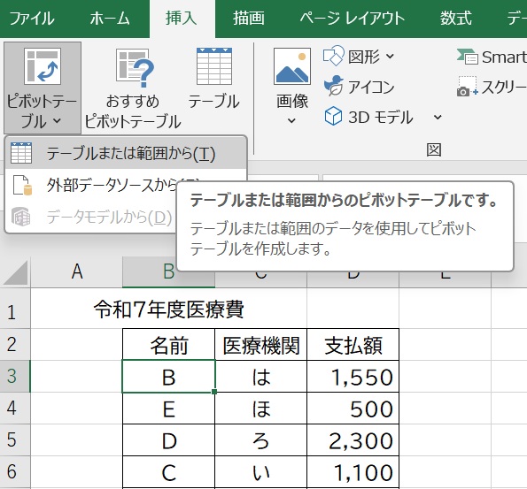 カーソルを表の中に置いてあると、その表を自動的に範囲を選んでくれているのでOKを押すと作成する欄が出てきますので、「名前」 「医療機関」 「支払い額」をクリックしたら集計は終了です。